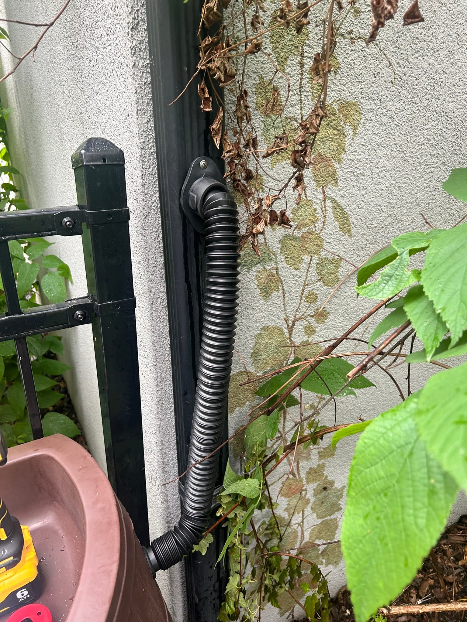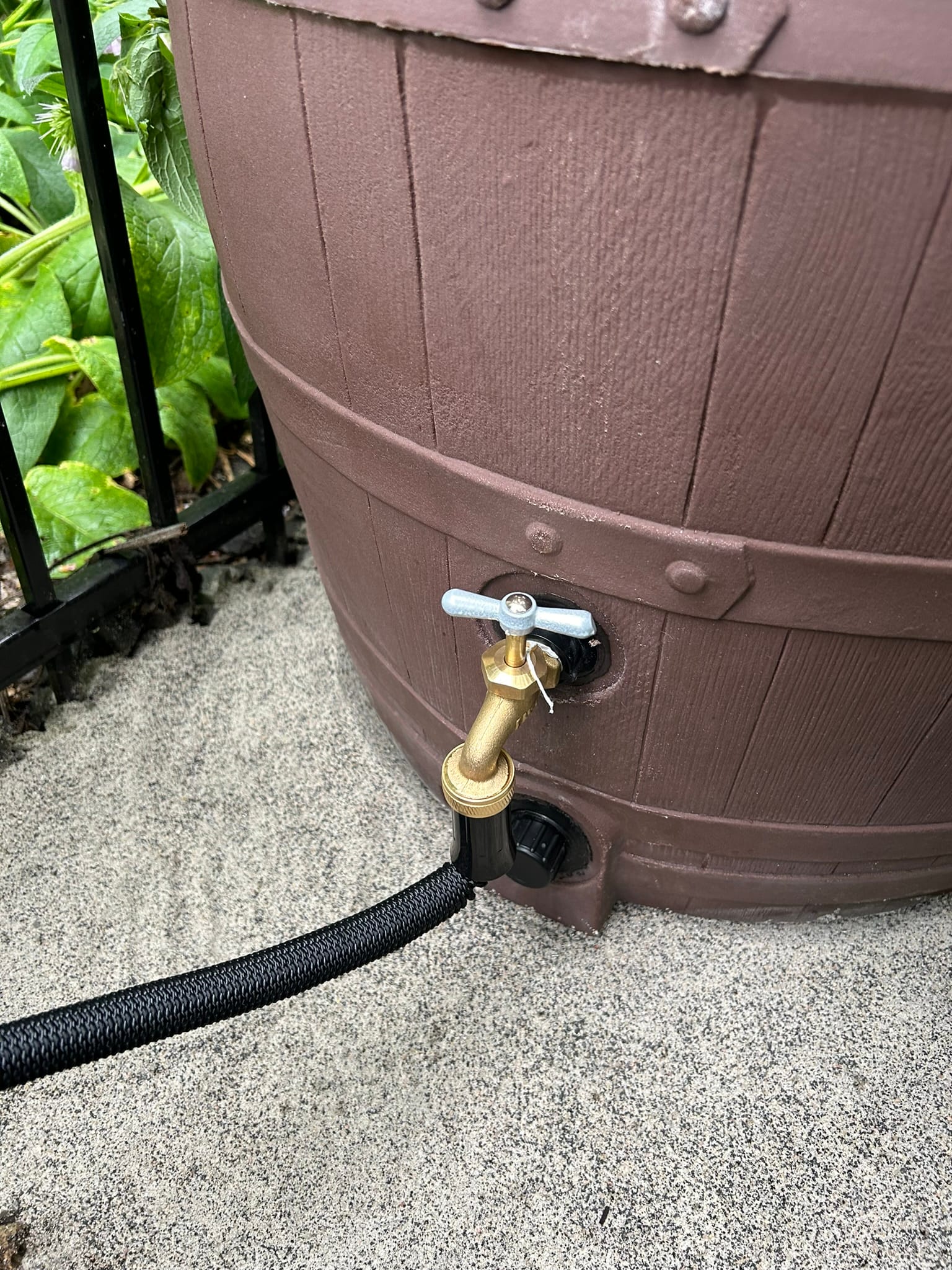 I applied some thread lock to the rain barrel's spout and connected our new hose.