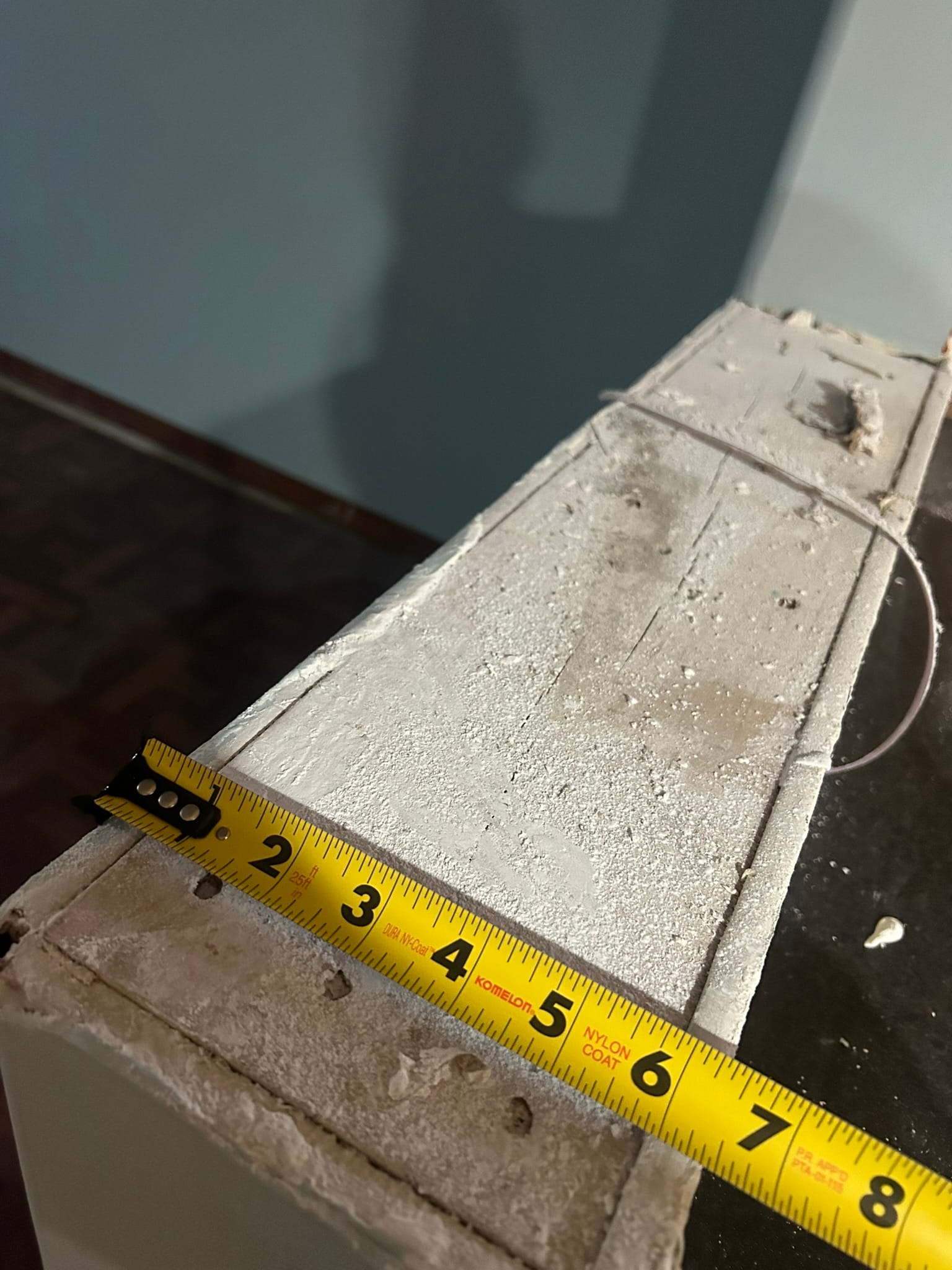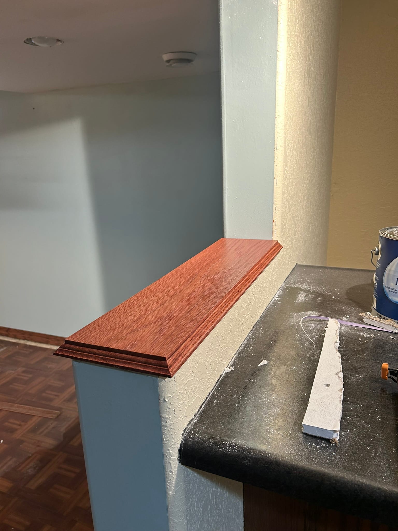 One small detail was a missing half wall cap next to the bar in the basement. I measured the half wall and bought a piece of red oak from Menards to finish and cover the stud. Much of the basement is a deep red color so this material matches the tone.