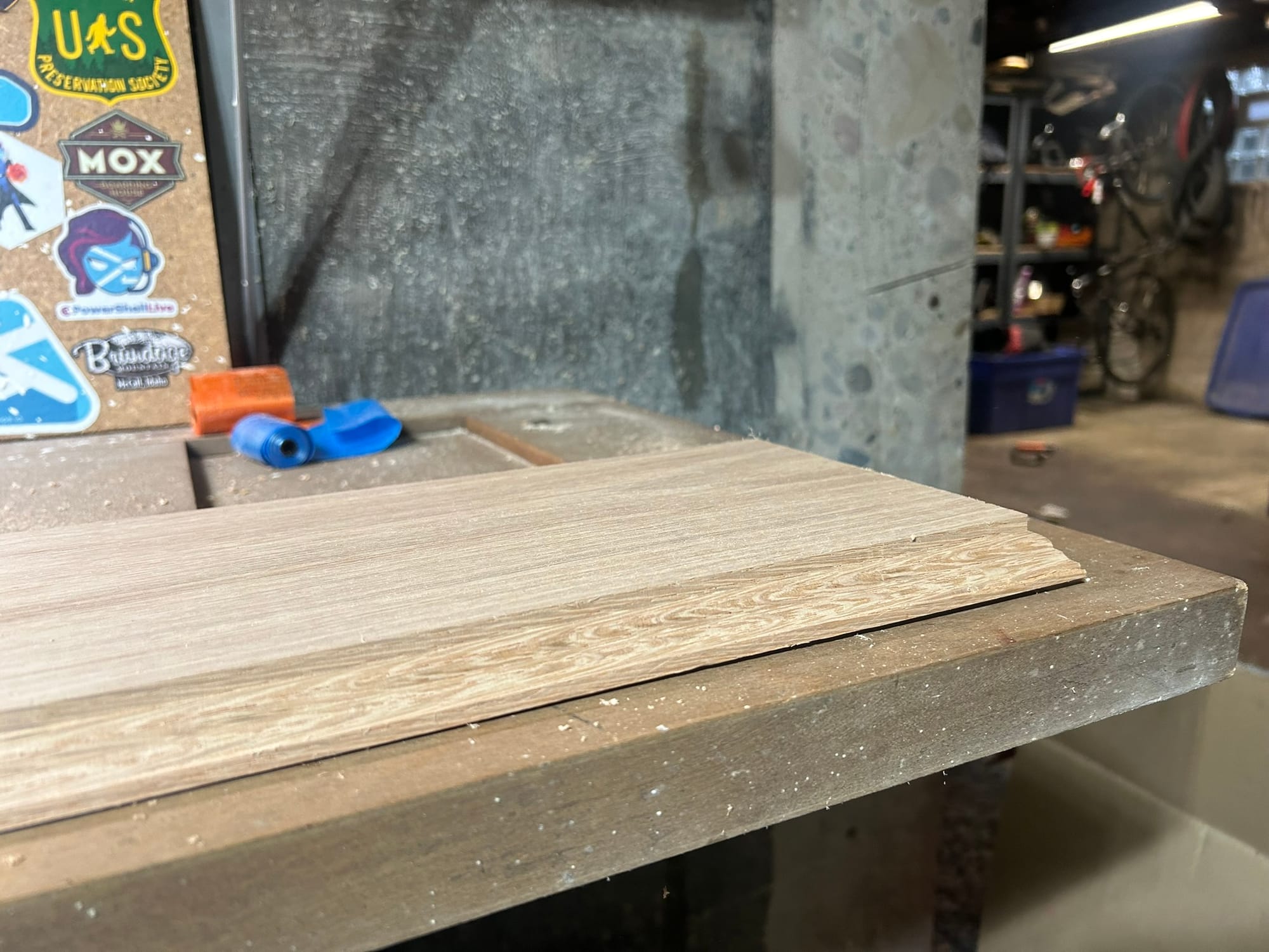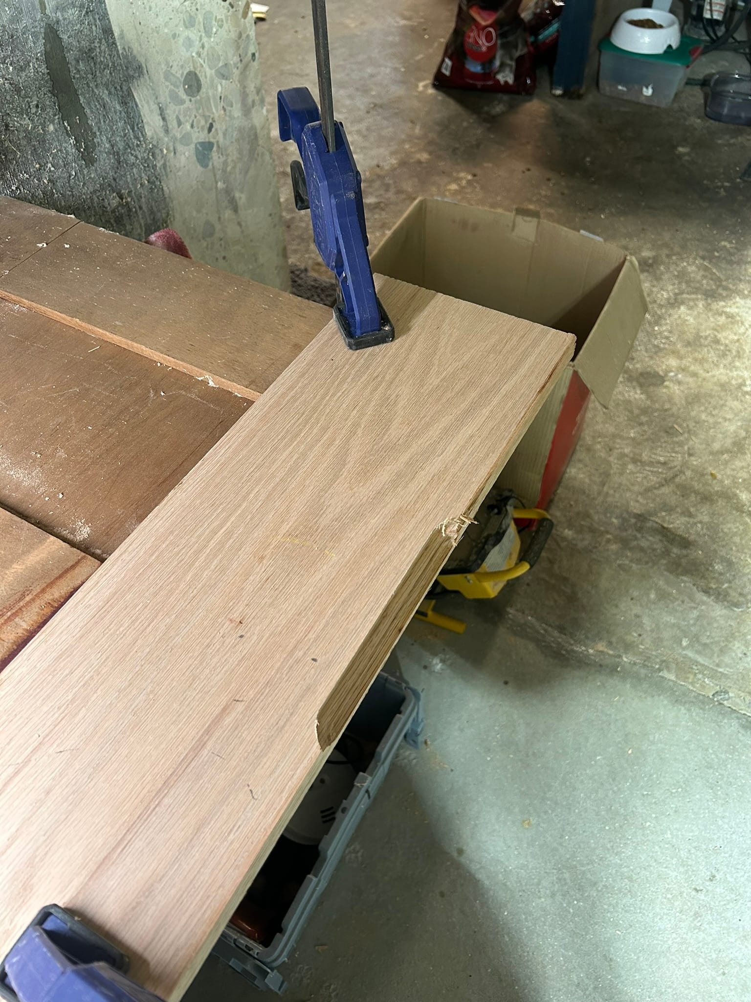 I used a Roman Ogee bit to edge the wood and give it a similar look to other finishings in the basement. I clamped the wood to my makeshift bench and routed along three sides. The fourth side is against the wall, so I did not edge it.