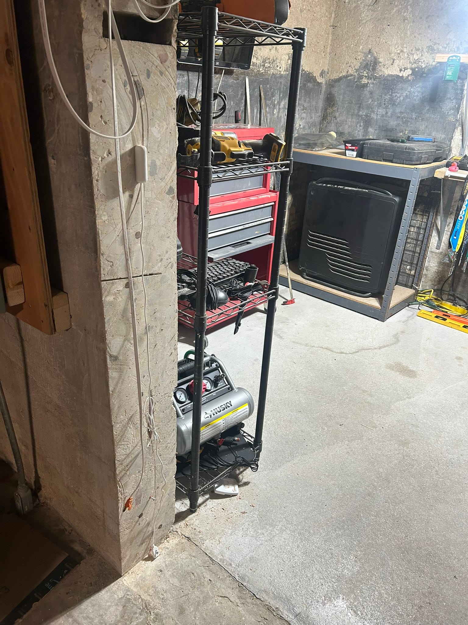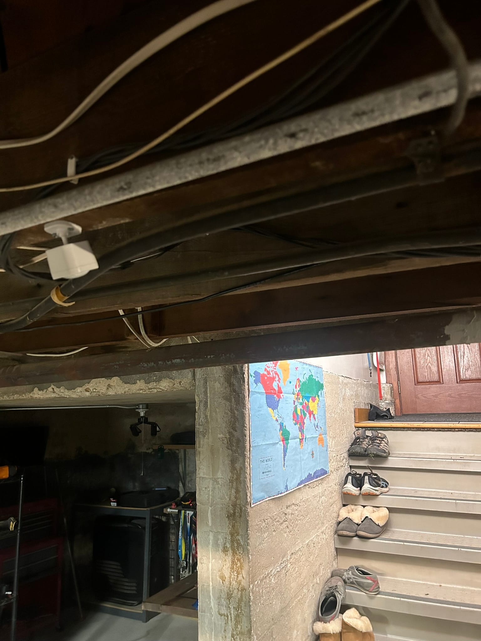 Also in the basement is a water sensor for leak detection. The sensor is actually 2 small nodes that must touch the ground. When they get in contact with water, the sensor will trigger. The controller is mounted above, and a wire is run to the floor.
