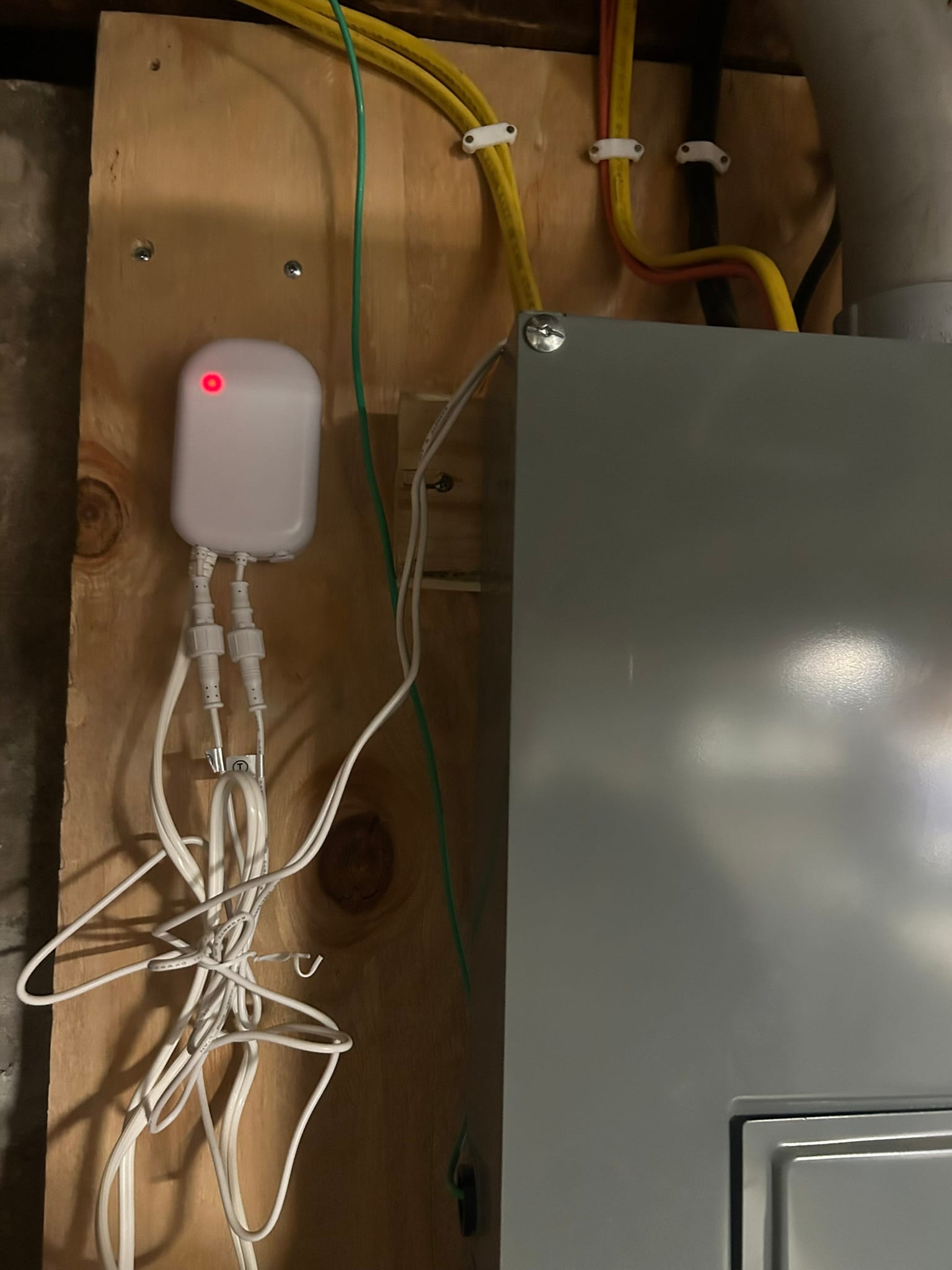 The basement also has an energy meter installed. It required opening the panel and putting clamps around the main lines into the house. A controller is mounted next to the panel. It sends energy usage data back to Home Assistant.