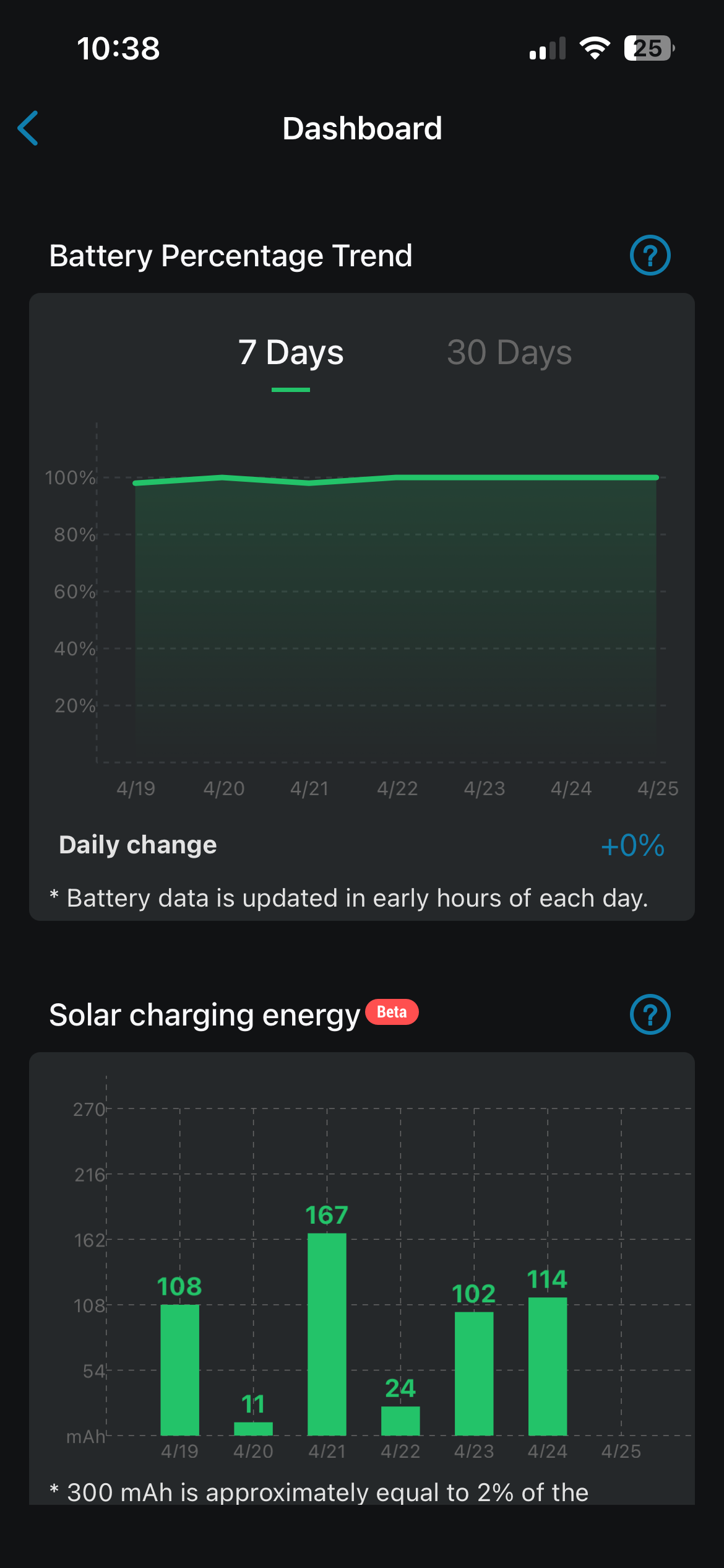 You can click the number under each camera to see a list of all the activity that the camera has picked up in the last few days. You can also view information like the charging status of the solar camera. It's cool to see the trend line. As you can tell, the camera usually doesn't drop below 90%.