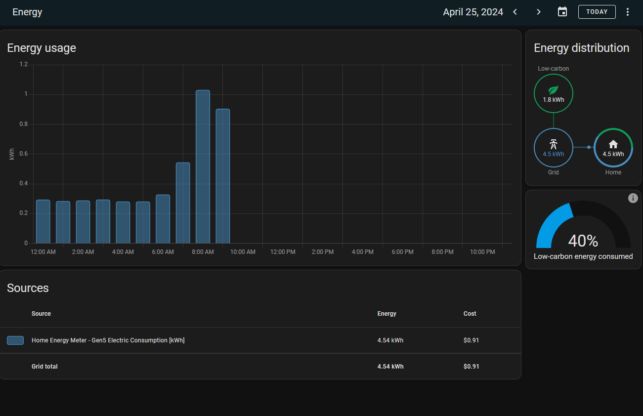 Because I have the home energy meter, Home Assistant will display the energy used over time. It's really neat to compare previous months (like winter vs spring) and you can clearly see when my wife chargers her electric car.