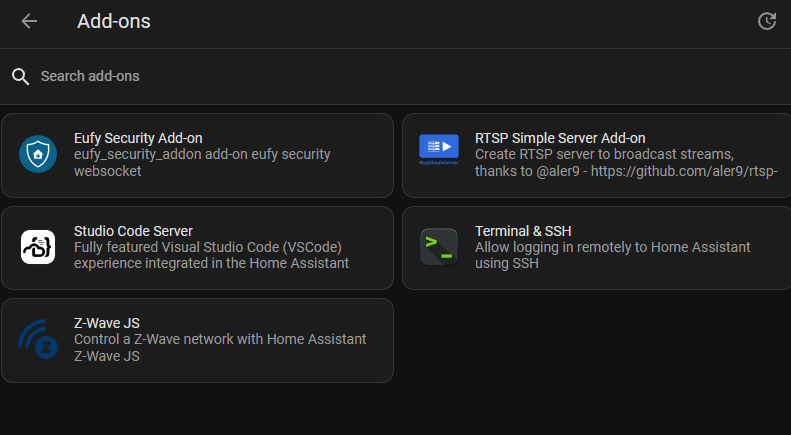 I'm using a few Home Assistant add-ons to control the network. I primary use the Z-Wave add-on that interfaces with the Z-Wave dongle and communicates with my devices. I have a couple of other helper add-ons. I added Eufy but didn't configure it.