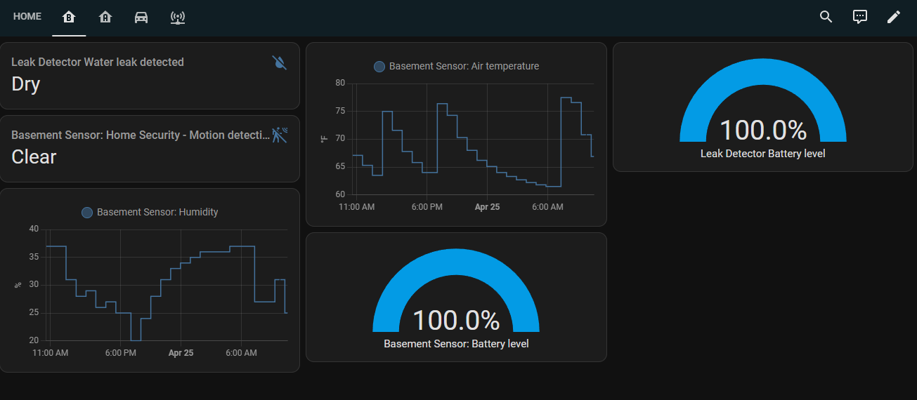 I've setup a few pages on the dashboard for floors in my home. Here's an example of the basement where you can see the water detection.