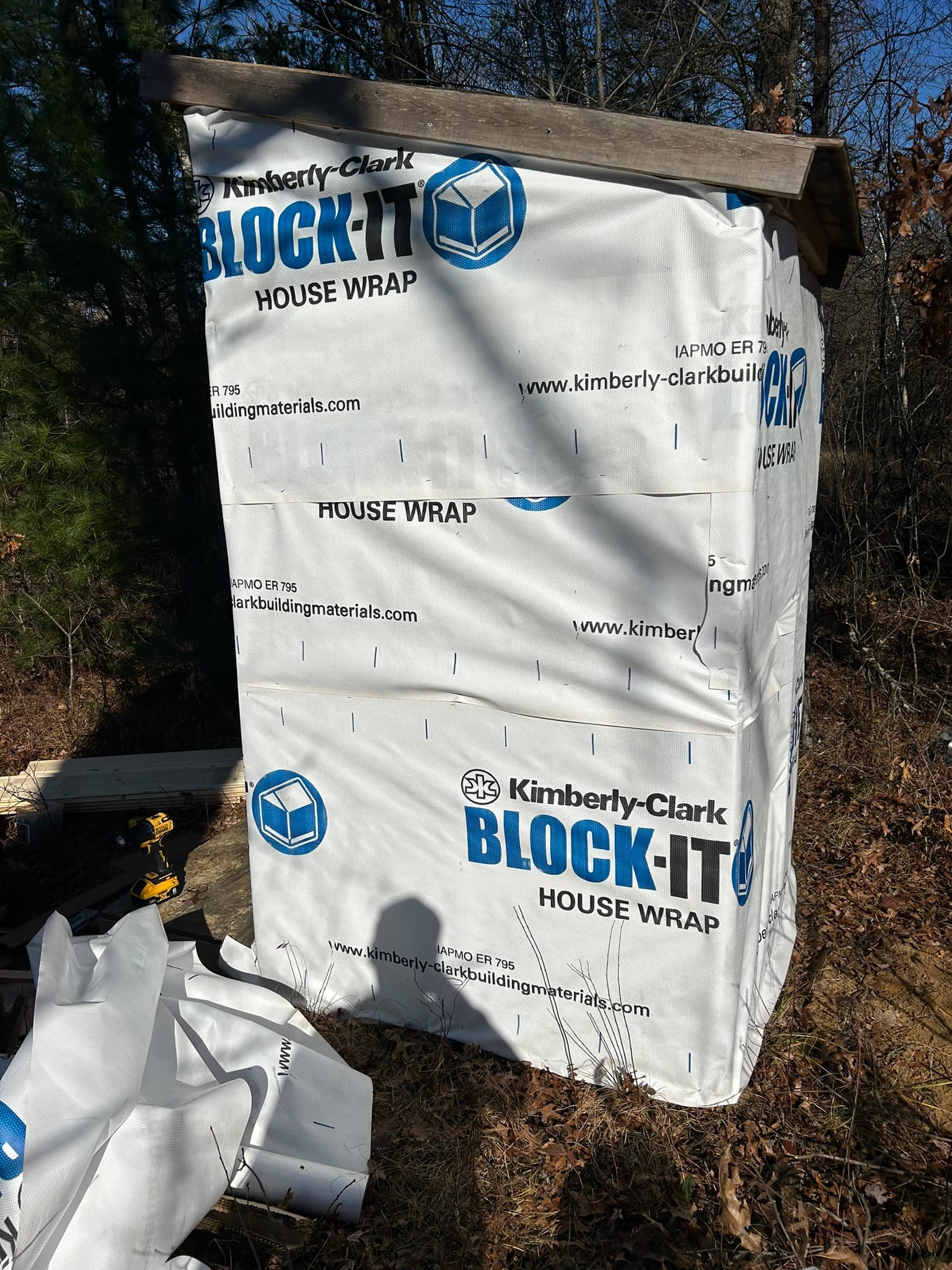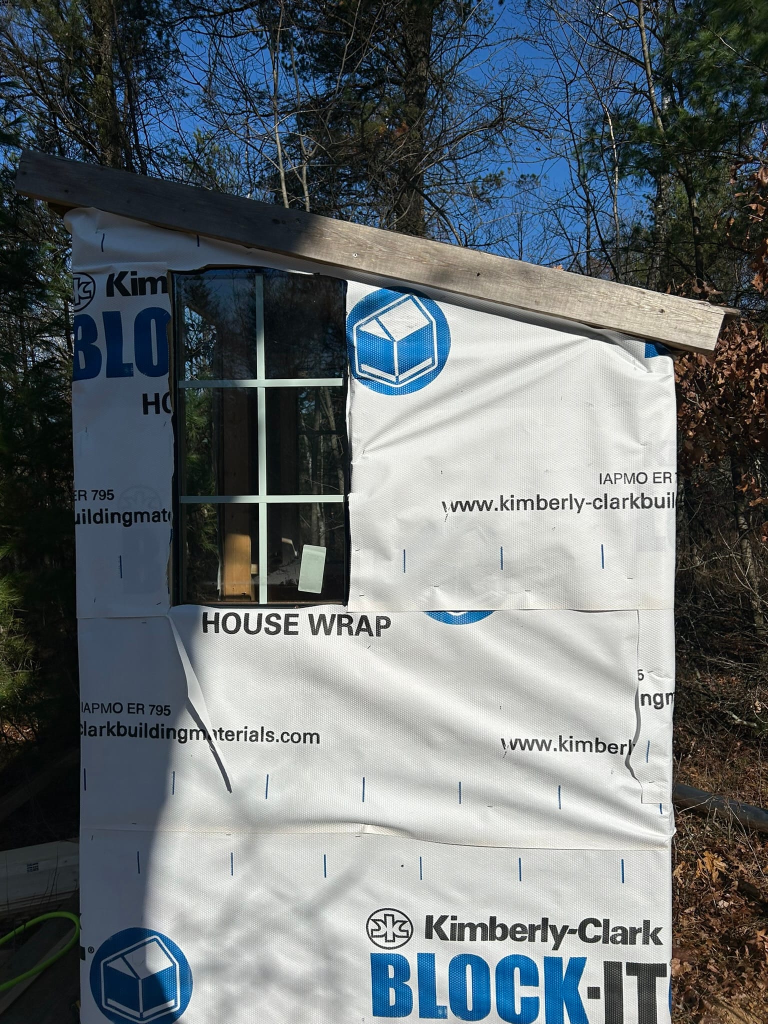 After framing out the windows, I wrapped the entire building in house wrap to better waterproof it. I used a stapler to attach it to the plywood and cut it with a utility knife. This was more annoying than expected but had a lot of extra so I could swear and cut all I wanted. It didn't end totally flat.