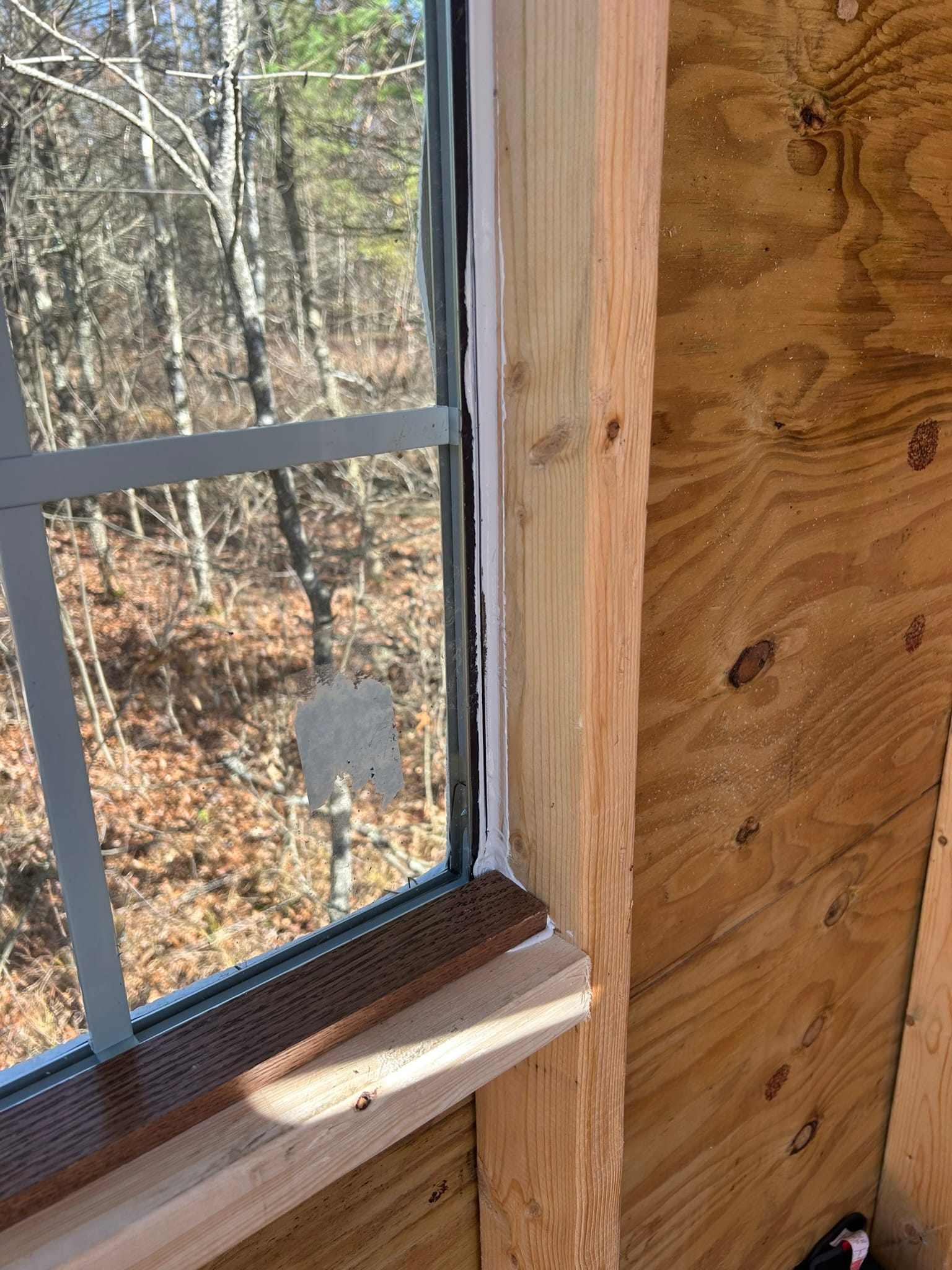 I cut out the windows and the exhaust vent hole with the utility knife and installed the windows. There was a bit of an edge at the top of the window frame, and I used some extra trim at the bottom of the window to hold it in place. I also laid down a bead of caulk around the window to seal everything up. Hopefully, no one leans on the window too hard because it will push right out.